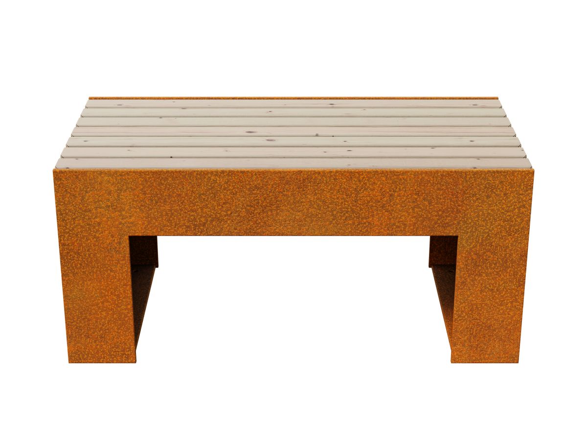 MASETA 2 puutarha/kaupungin penkki on tukeva, valmistettu 8 mm Corten-levymetallista. Vakiovarusteena kuusipuusta valmistettu istuin, joka on suojattu kahdesti matalla lakalla. Varustettu rei’illä maahan kiinnittämistä varten.