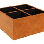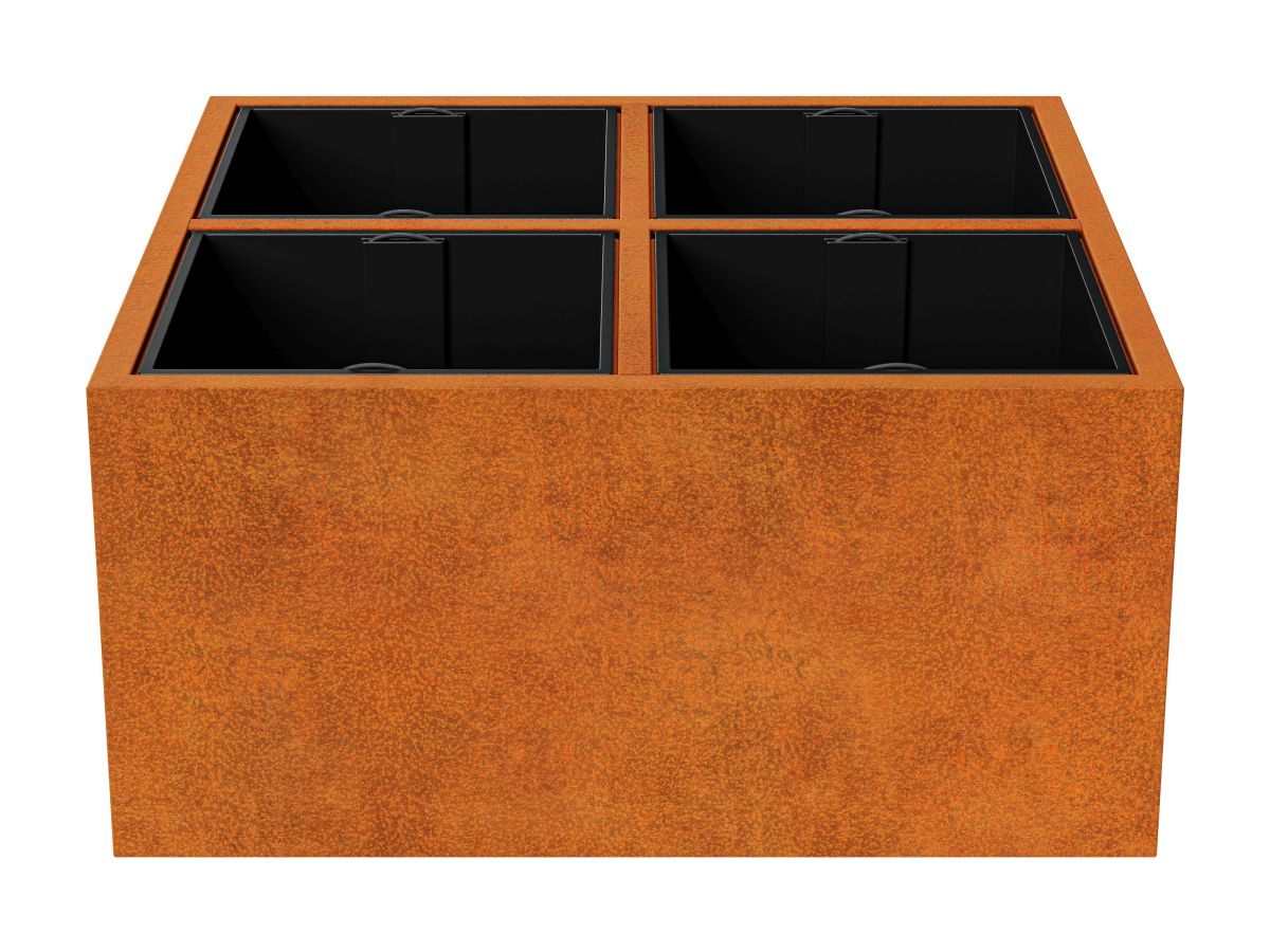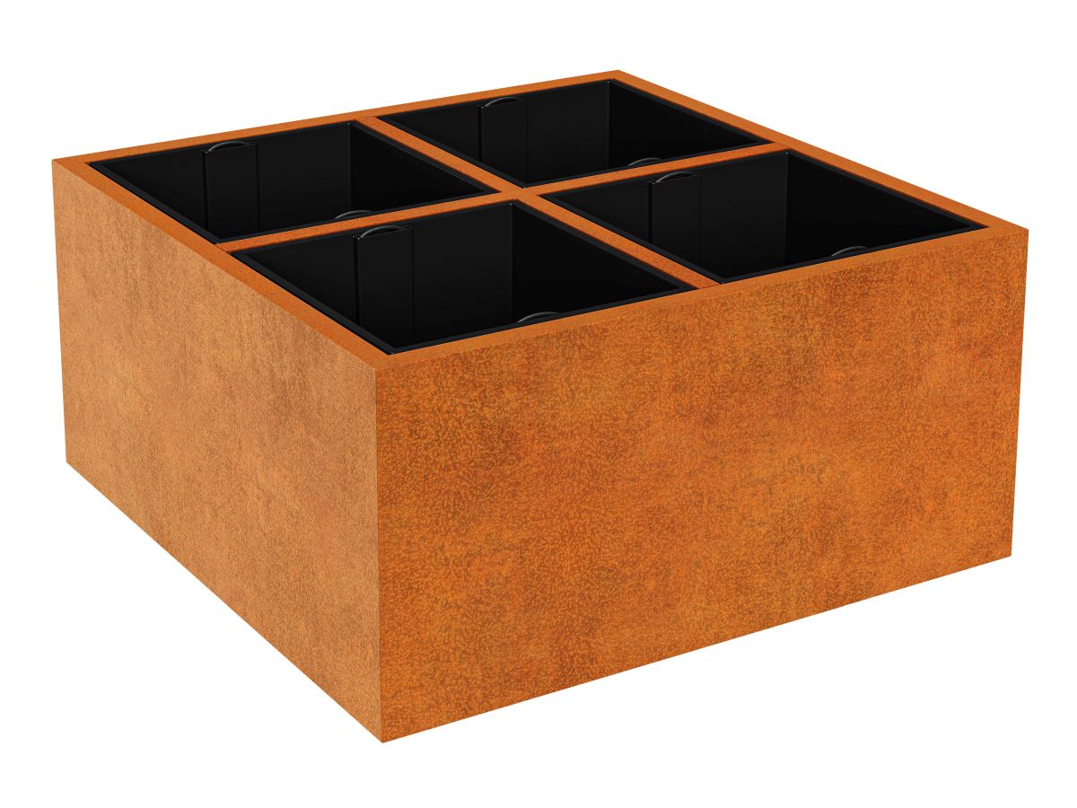 DEPO IDE 6 on corten-teräksestä valmistettu puutarha-astia, jonka paksuus on 2 mm, tarkoitettu kasvien istuttamiseen muovisiin, irrotettaviin astioihin, jotka sisältyvät settiin. Vakiovarusteena astiassa on jalat.
