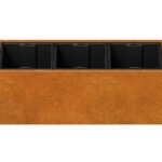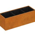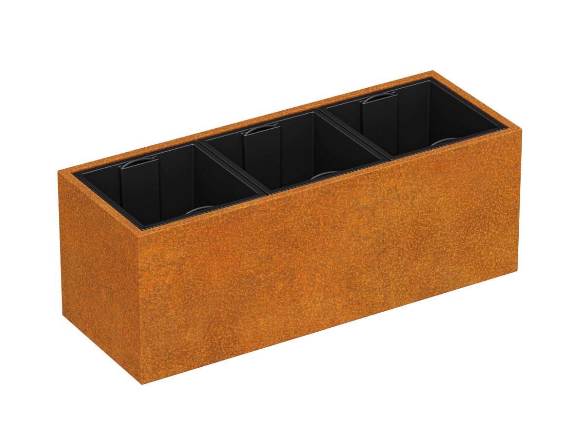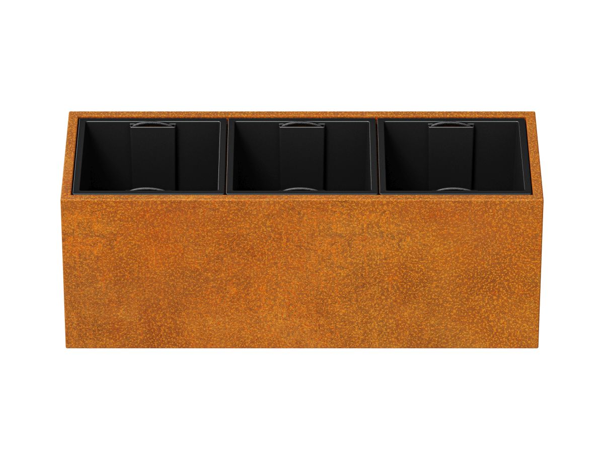 DEPO MINI 7 on corten-teräksestä valmistettu puutarha-astia, jonka paksuus on 2 mm, tarkoitettu kasvien istuttamiseen muovisiin, irrotettaviin astioihin, jotka sisältyvät settiin. Vakiovarusteena astiassa on jalat.