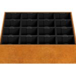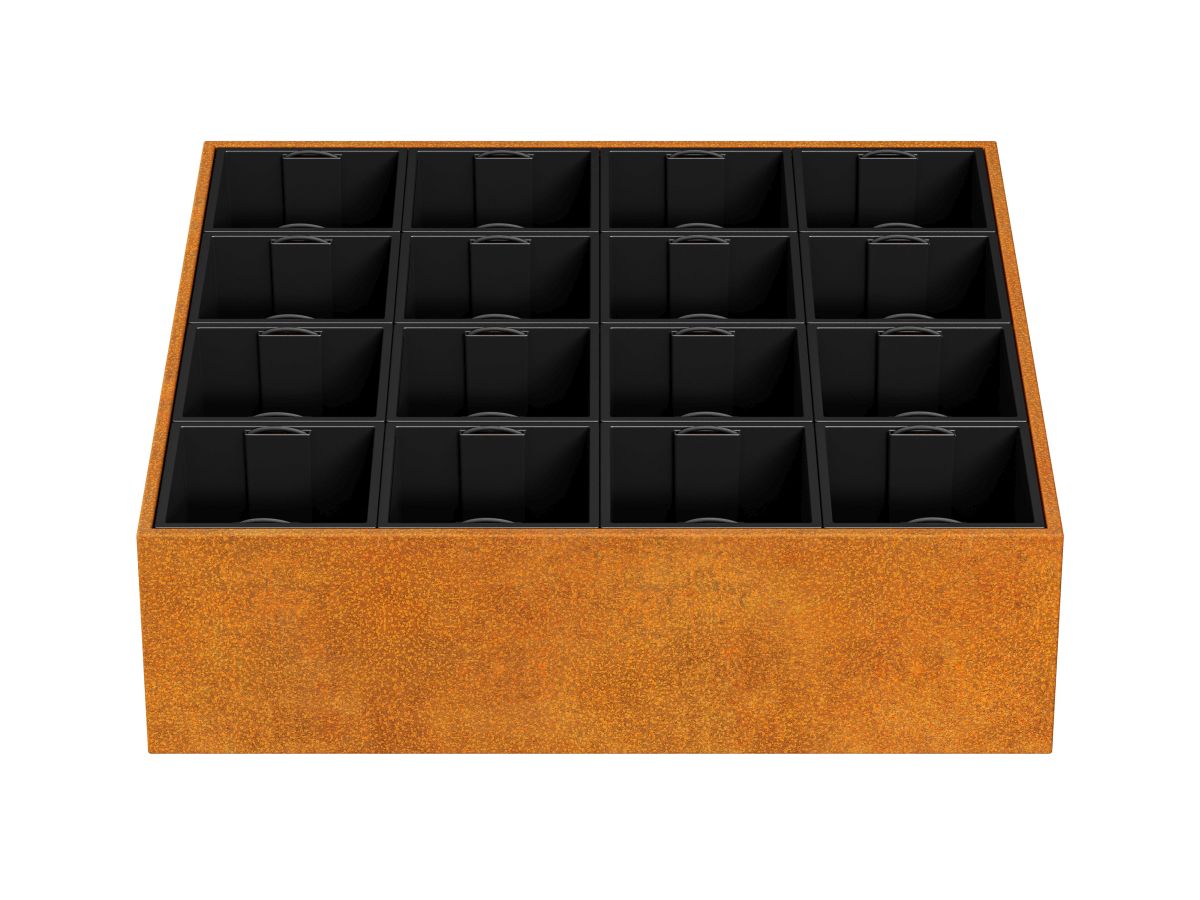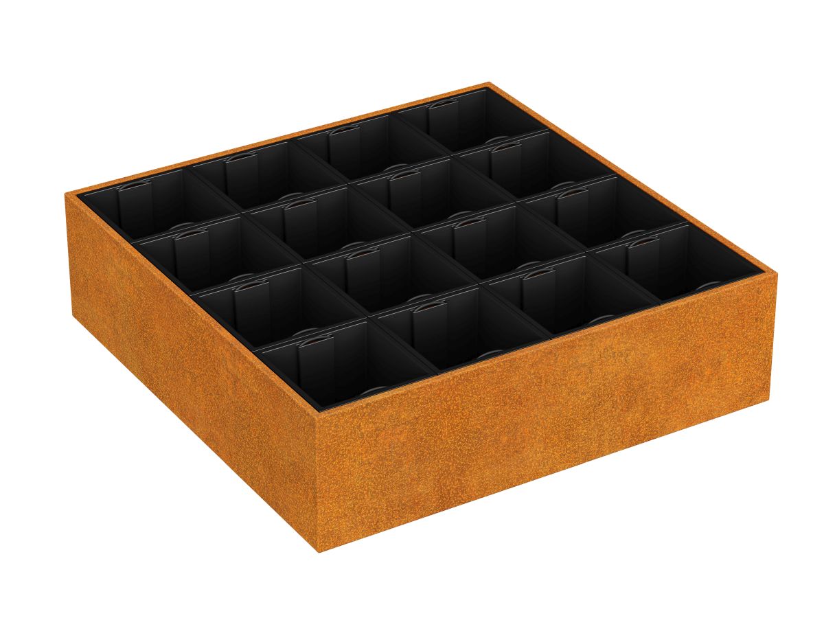 DEPO MINI IDE 7 on corten-teräksestä valmistettu puutarha-astia, jonka paksuus on 2 mm, tarkoitettu kasvien istuttamiseen muovisiin, irrotettaviin astioihin, jotka sisältyvät settiin. Vakiovarusteena astiassa on jalat.