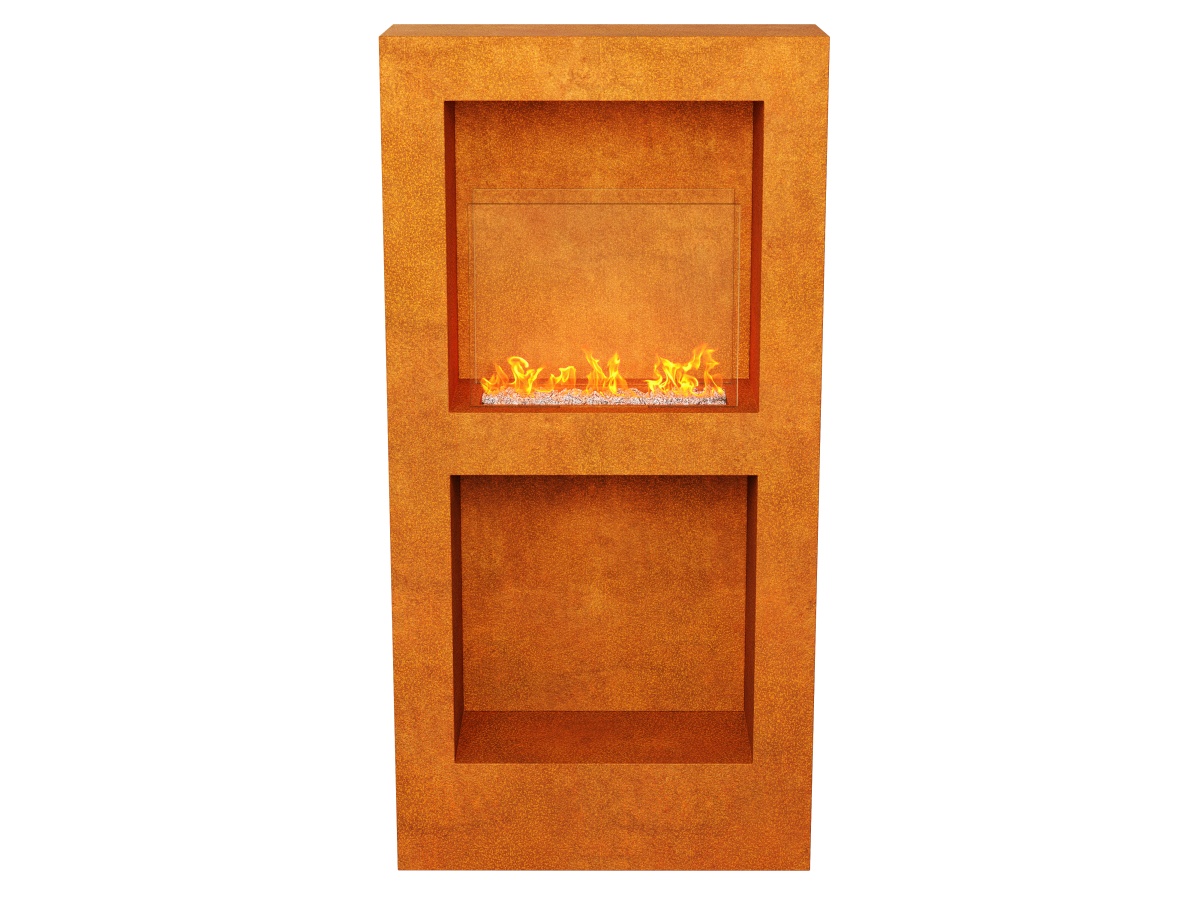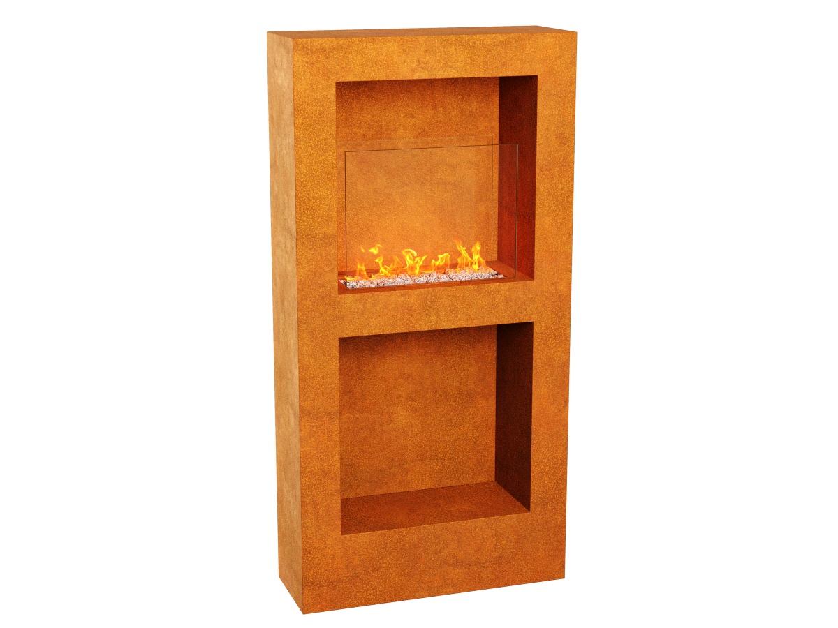 TRIO BZ biofireplace made of 2 mm thick corten steel. Equipped with 4mm thick fireplace glass. Ideally suited for gardens or patios. After preparation – also for interiors.