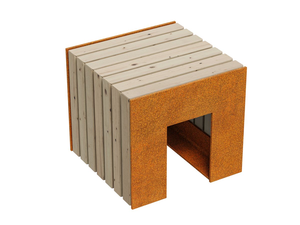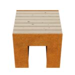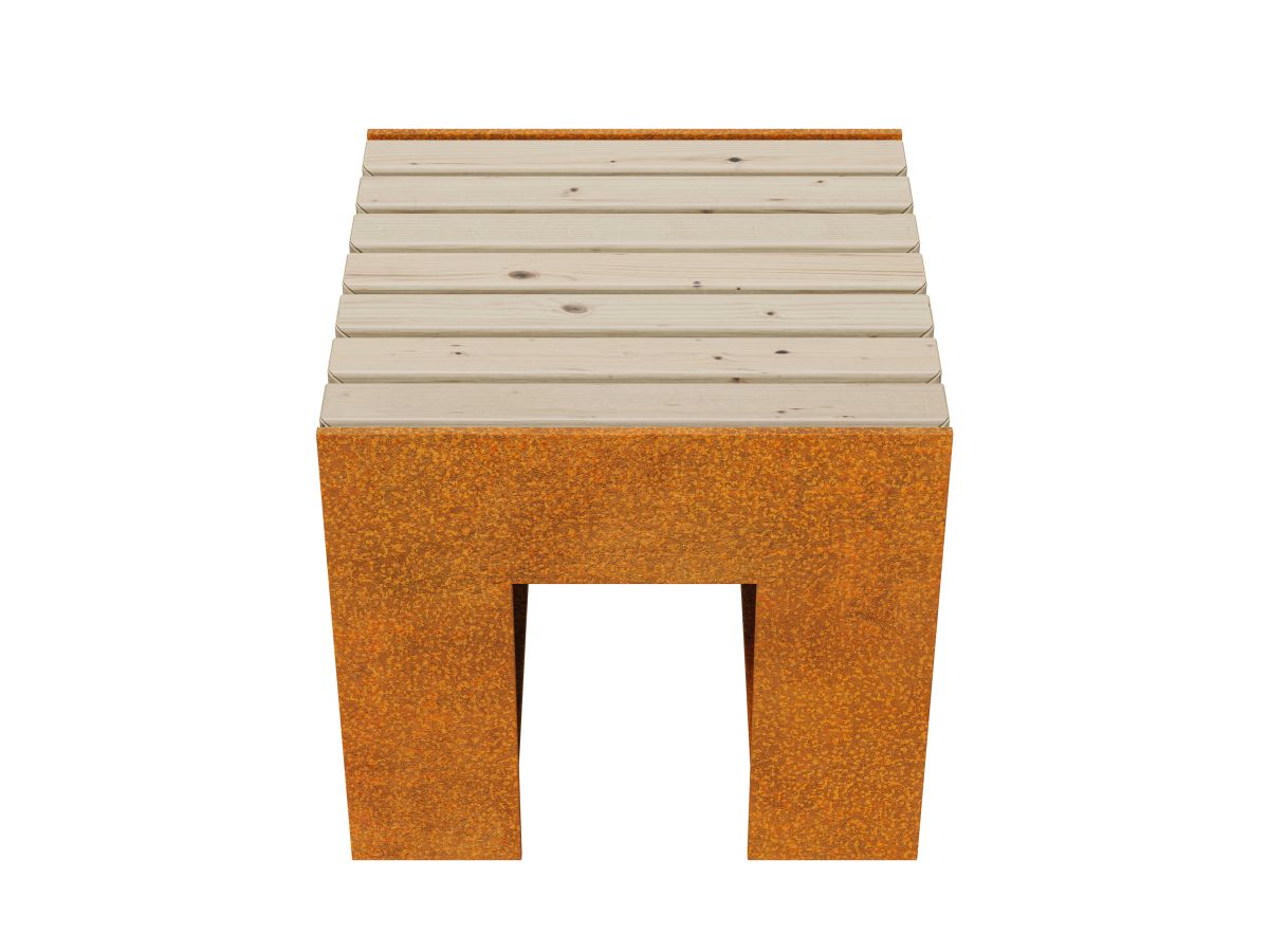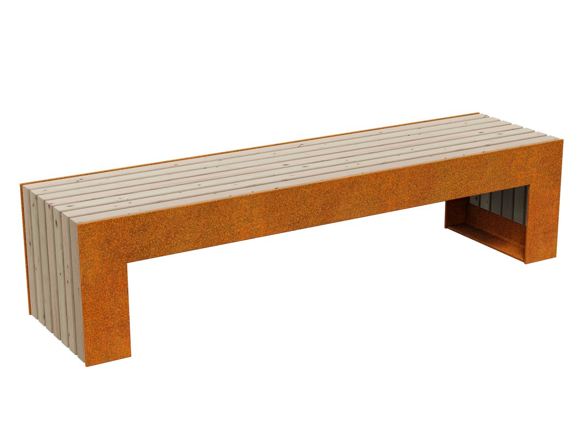 MASETA 1 is a solid bench, made of 8mm Corten steel. The standard seat is made of exotic wood, protected twice with matte varnish, so in reality the wood is darker than in the photo. Equipped with holes for mounting in the ground.
