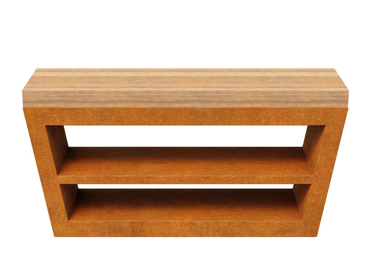 MESA 4 is a large trapezoidal table made of cor-ten steel. An additional worktop, a shelf for accessories and a place for wood are just some of the advantages of our table .. The standard equipment includes adjustable legs, while it is possible to mount wheels to make the table more mobile. It is perfect for tastings, presentations, festivals, or simply on the terrace or in the garden.