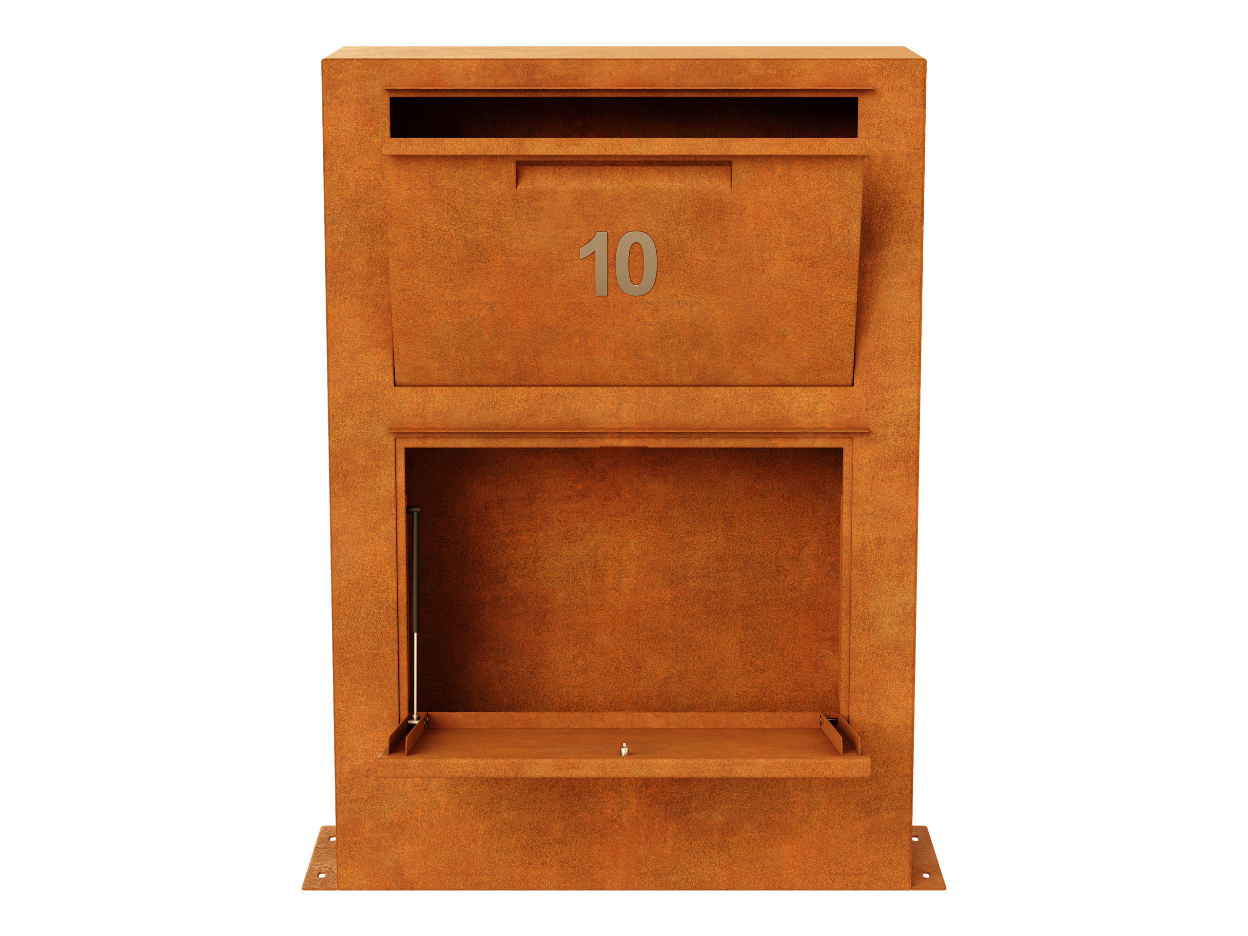 BUZON 7 is a large, single, modern, rectangular letterbox with a home parcel locker function. It was made of corten steel.