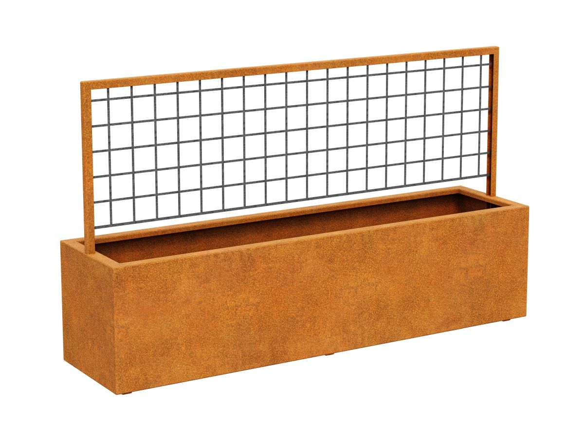 RED CENTRO 5 it is a large pot with a pergola in one. It is made of 2 mm corten steel. It has legs and drainage holes. Intended for restaurants, gardens, city old towns, terraces, balconies or common parts of development facilities.