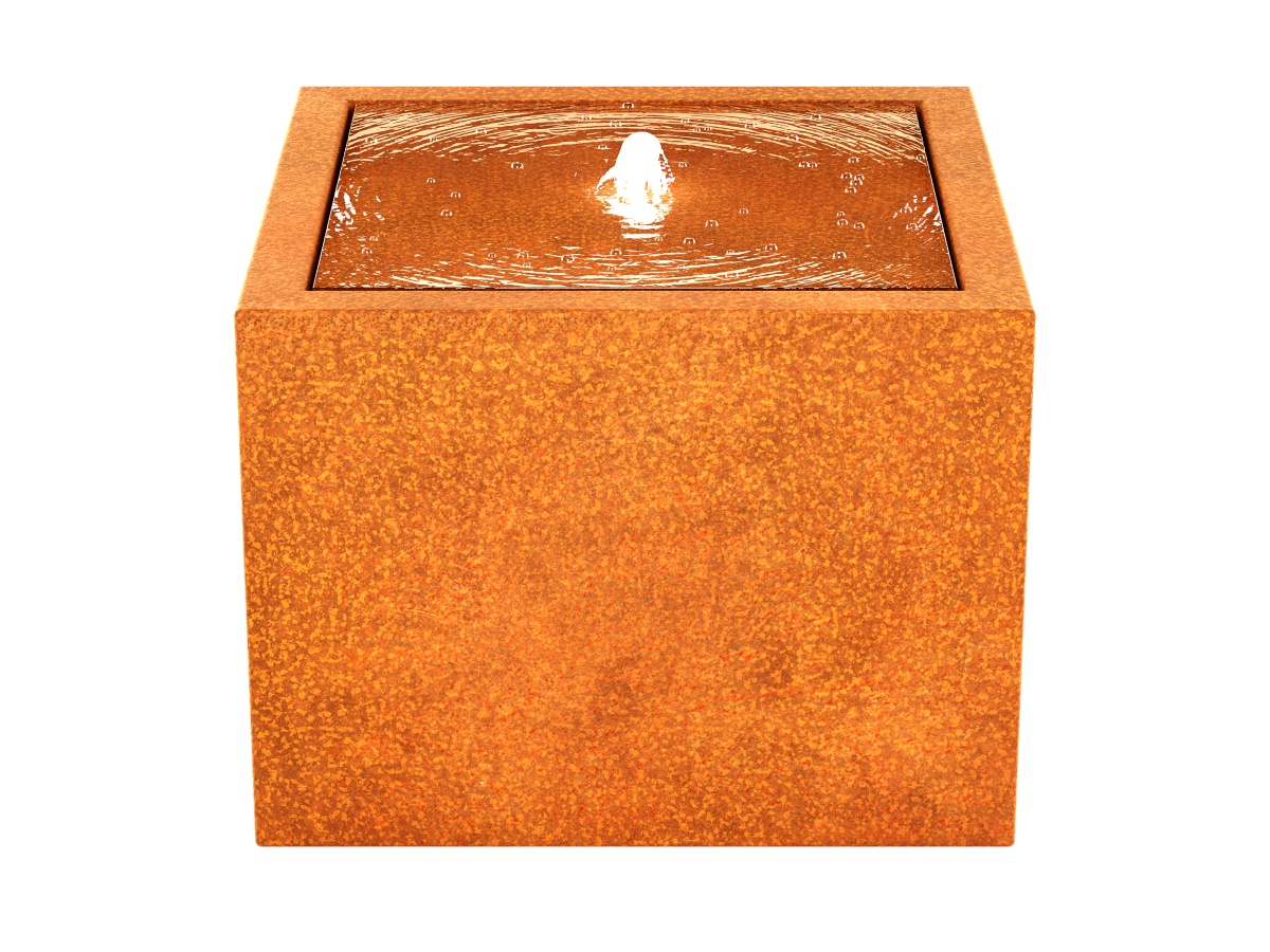 FUENTE FW1 is a closed-circuit garden fountain. It was made of 2mm thick corten steel. Fountains made of Corten steel are very durable and require no maintenance. The set includes a high-quality water pump, and LED lights with a nozzle have been built-in in the upper part. The set is ready to start – the only thing you need to do is pour water into the tank and connect the plug to the power supply.