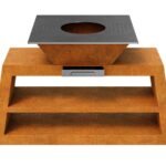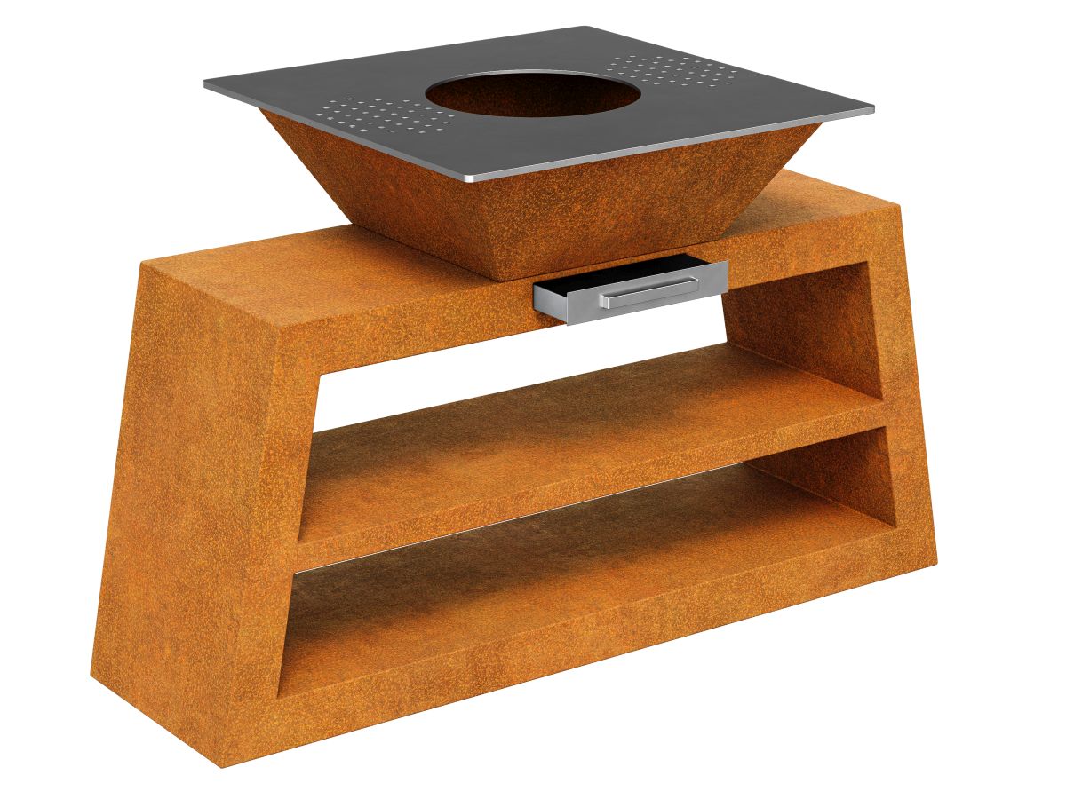 COCCINA 3 is a geometric hearth, grill and outdoor kitchen in one. The body is made of corten sheet, and the grill plate and grate are made of stainless steel – dedicated to contact with food products. The grill has a removable ash container, which will facilitate cleaning. We have placed a shelf in the stand that can be used as an organizer for kitchen utensils or simply as a wood stand. As standard, the item is delivered with adjustable feet, while on customer’s request it is possible to use wheels or a peg with a brake. Perfect for professionals as well as for amateurs of sky-high cooking. Perfect for use on terraces, balconies, gardens, festivals or other organized events.