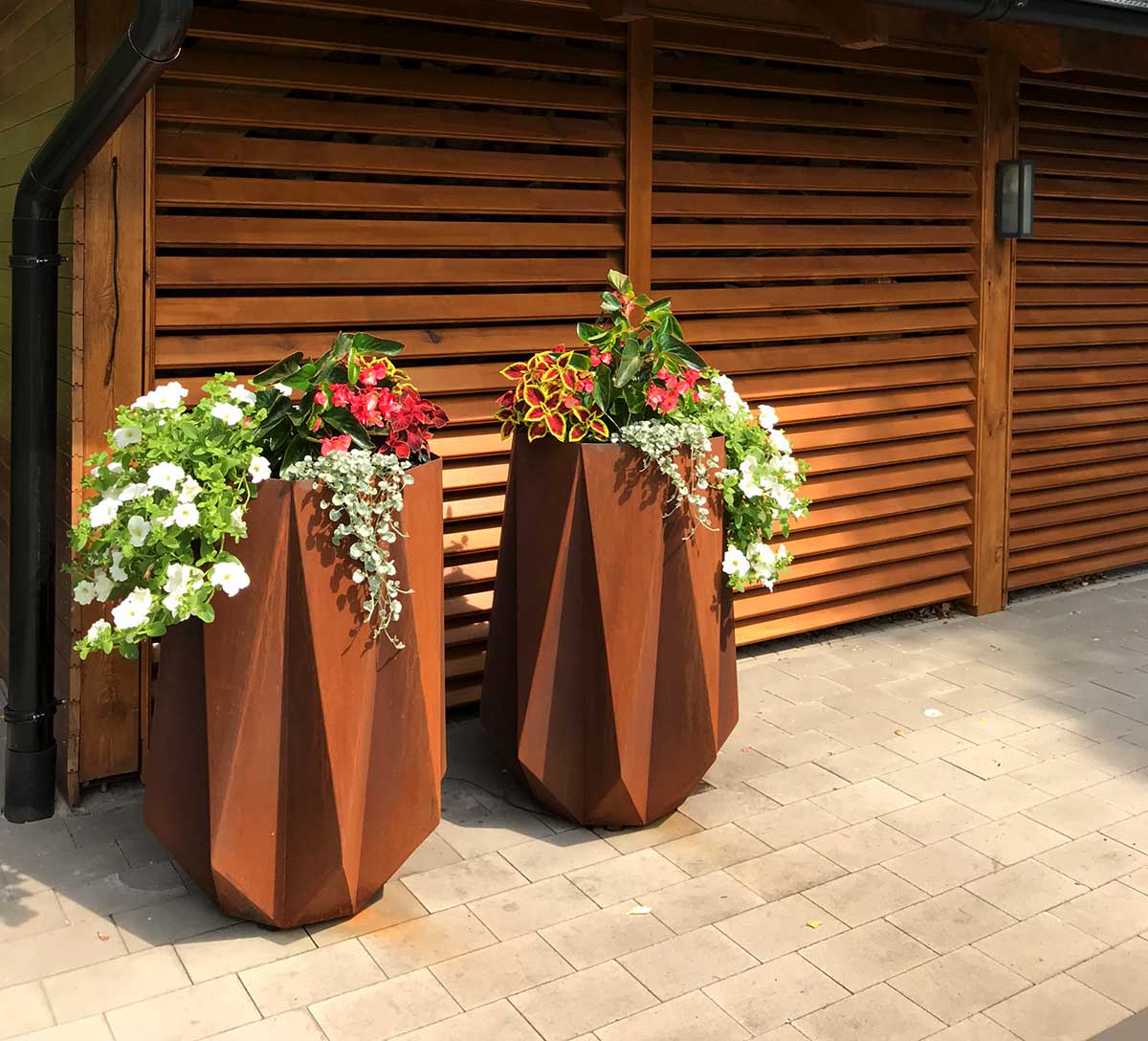 CRISTAL is a tall garden pot. It was made of 2mm thick corten steel. Pots made of Corten steel are very durable and require no maintenance. There are drainage holes in the bottom. The design of this block has been often appreciated by a wide range of architects. It can be used as a garden, balcony and terrace pot. It also fits perfectly into gazebos, patios, parks and urban areas. It works perfectly as a complement to the industrial, rustic, Norwegian, modernist and many other styles. The lump pot looks impressive, especially in plant compositions, e.g. in decorative flowers.