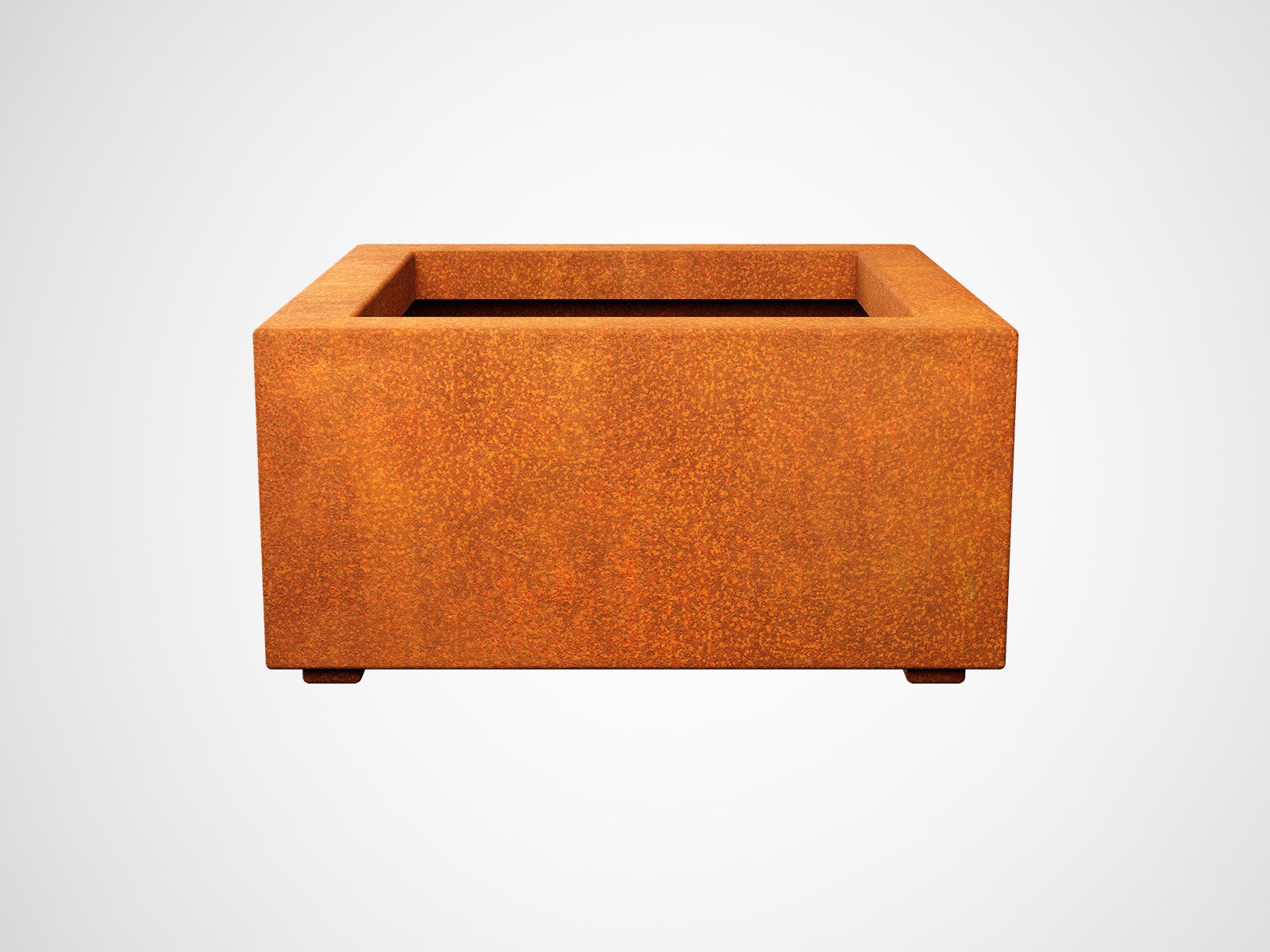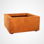 BAJO2 is a small, square garden pot. It was made of 2mm thick corten steel. As standard, the pot is equipped with drainage holes in the bottom and legs.