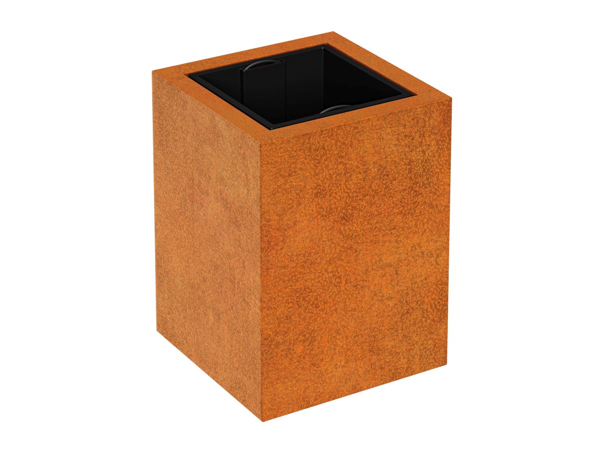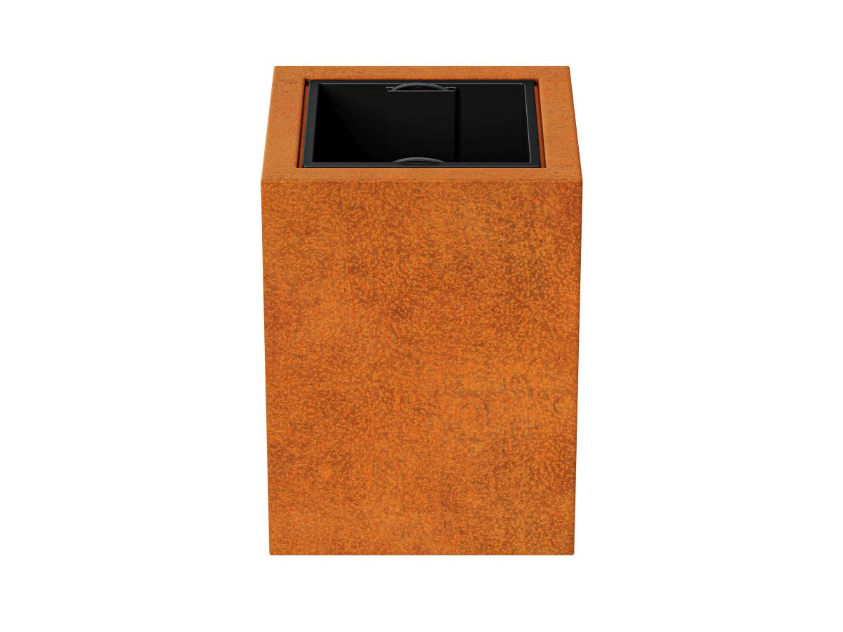 DEPO 2 is a garden pot made of corten steel with a thickness of 2 mm, intended for planting plants in plastic, removable containers, included in the set. As standard, the pot is equipped with legs.